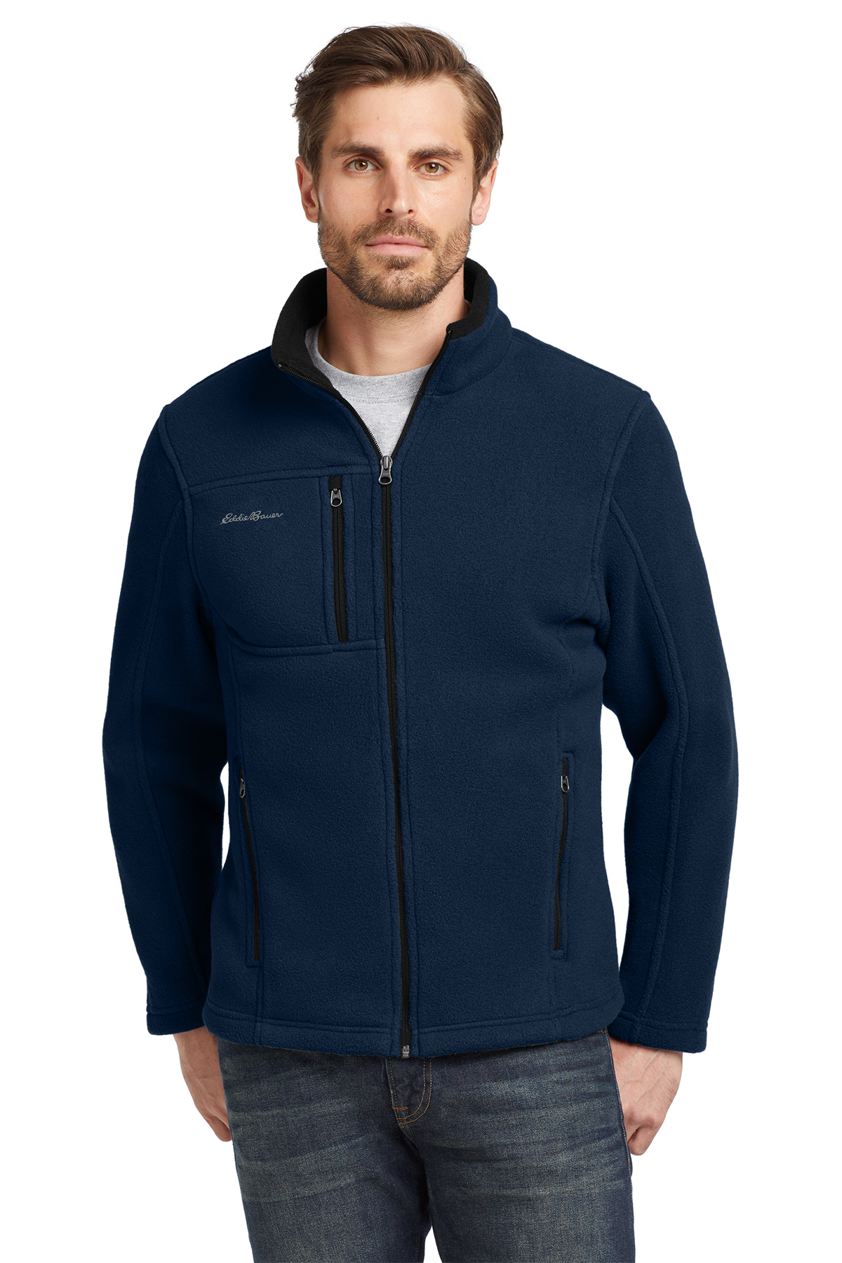 6.9-ounce, 100% polyester fleece Produced using Low Impact Technology (L.I.T.™) which uses less dyestuffs, thermal energy and water for enhanced softness, performance and after-care quality Contrast roll-top collar Zippered chest pocket Contrast reverse coil zippers Front zippered pockets with tricot lining Open cuffs and an open hem Contrast embroidered Eddie Bauer logo on right chest